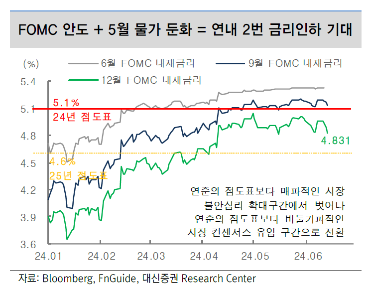 - 미국 경기 둔화와 금리 인하 기대: 최근 미국 경제는 전반적인 둔화 흐름을 보이고 있습니다. 이는 연준의 금리 인하 기대를 증대시키는 요소로 작용하고 있습니다. 연준은 올해 3회 금리 인하를 예상했으나, 물가 안정세가 뚜렷하게 나타나면서 금리 인하 명분은 더욱 강화되었습니다. 5월 CPI(소비자물가지수)와 PPI(생산자물가지수)는 모두 시장 예상을 하회하는 상승률을 기록하며 물가 안정 기대를 높였습니다. 3분기 중 미국 CPI 상승률이 2%대로 진입할 것으로 예상되면서, 연준의 금리 인하 결정이 앞당겨질 가능성이 큽니다.