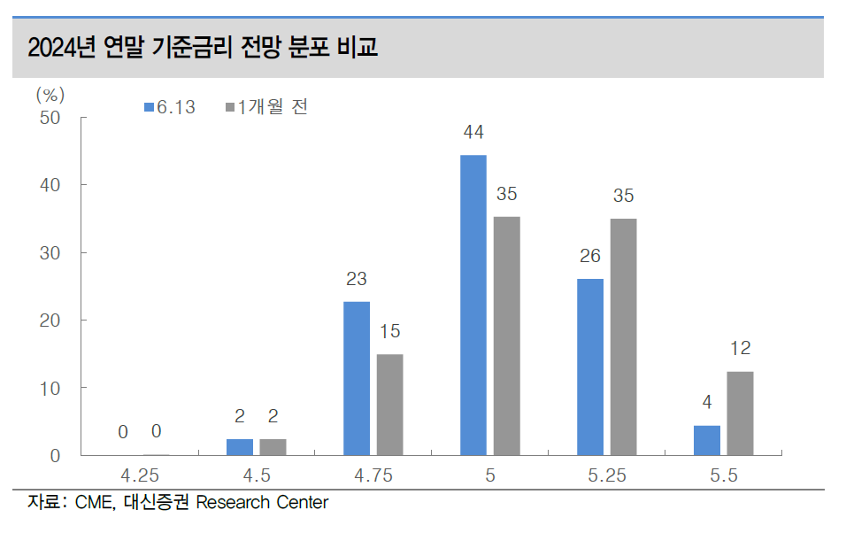 - 인하 횟수 감소: 연준은 올해 기준금리 인하 전망을 3회에서 1회로 줄였지만, 이는 5월 물가 지표가 반영되지 않은 결과입니다. 물가 지표가 반영될 경우 인하 횟수가 다시 늘어날 가능성이 있습니다. 시장은 여전히 올해 2번의 금리 인하를 예상하고 있으며, 이는 채권 시장에 긍정적인 영향을 미칠 것입니다.