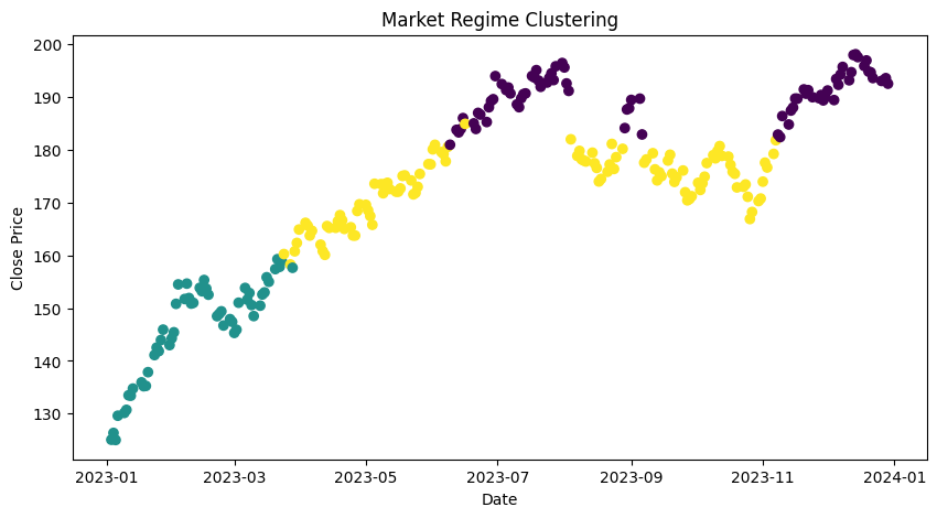 plt.figure(figsize=(10, 5)) plt.scatter(df.index, df['Close'], c=df['Cluster']) plt.title('Market Regime Clustering') plt.xlabel('Date') plt.ylabel('Close Price') plt.show()