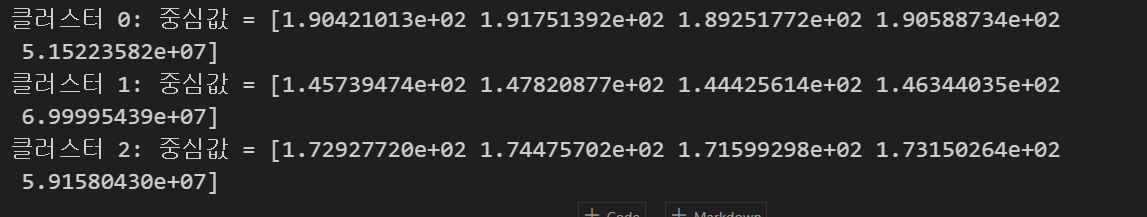 이 코드는 다음과 같은 과정을 통해 클러스터 중심값을 확인합니다: