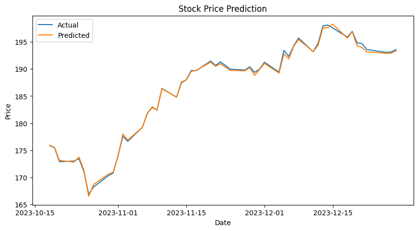 - 예측 모델: 단순 선형 회귀 모델을 사용하여 다음 날 주가를 예측합니다.