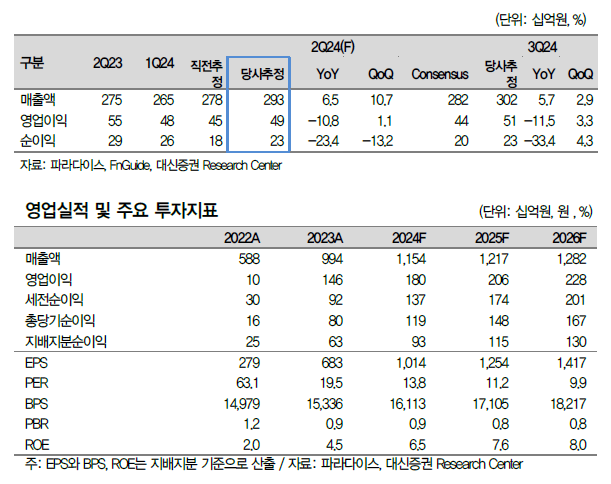 파라다이스의 2분기 연결기준 매출액은 2,932억원(QoQ +10.7%, YoY +6.5%), 영업이익은 484억원(QoQ +1.1%, YoY -10.8%)으로 컨센서스를 상회하는 호실적이 예상됩니다. 일본의 골든위크와 중국의 노동절 연휴 효과로 2분기 홀드율은 12.7%로 개선될 것입니다. - 코스피 이전 상장 효과