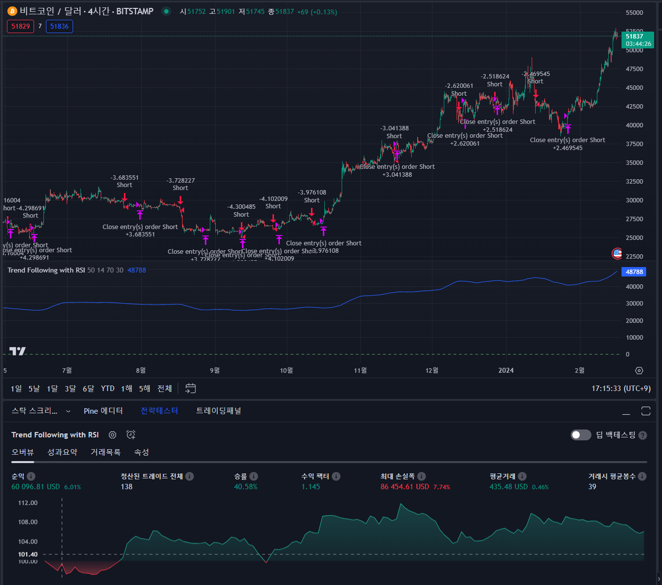 - 지표 사용: 트렌드 방향을 위한 SMA와 진입 신호를 위한 RSI를 결합하여, 트렌드 추종과 모멘텀을 모두 활용합니다.